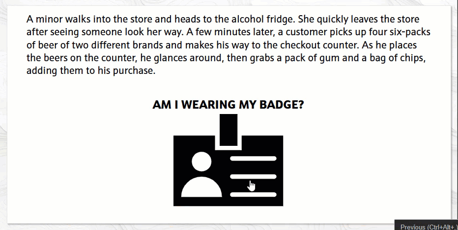 I updated the existing Alcohol & Tobacco Sales training with Store Director check-ins (below), providing concrete experience for learners through simulated sales scenarios that allowed for varied means of expression and action, adhering to Universal Design Principles.